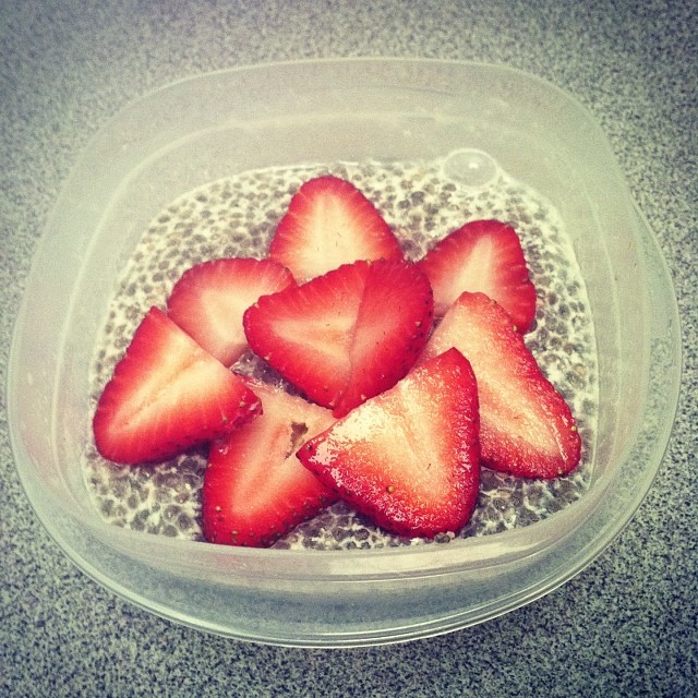 In a small storage container, combine the chia seeds and almond milk. Add the vanilla extract and agave syrup and mix. Cover and cool in the fridge for at least four hours (I usually make this before I go to bed for the next day’s breakfast.) Check once or twice to make sure the seeds aren’t sticking together or your pudding will have a lumpy consistency.