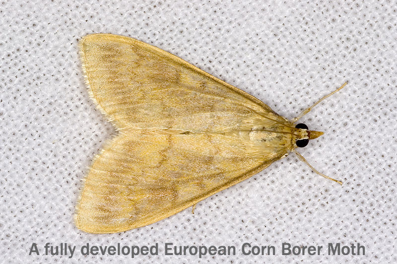 | How does the corn borer damage a corn crop? Fully developed female corn borer moths lay clusters of eggs on the undersides of corn leaves. Once the eggs hatch via the caterpillars chewing their way out, the destruction begins. The caterpillars chew tunnels into the ears of corn, as well as the stalks, which then causes the plant to flop over and effectively killing it. |