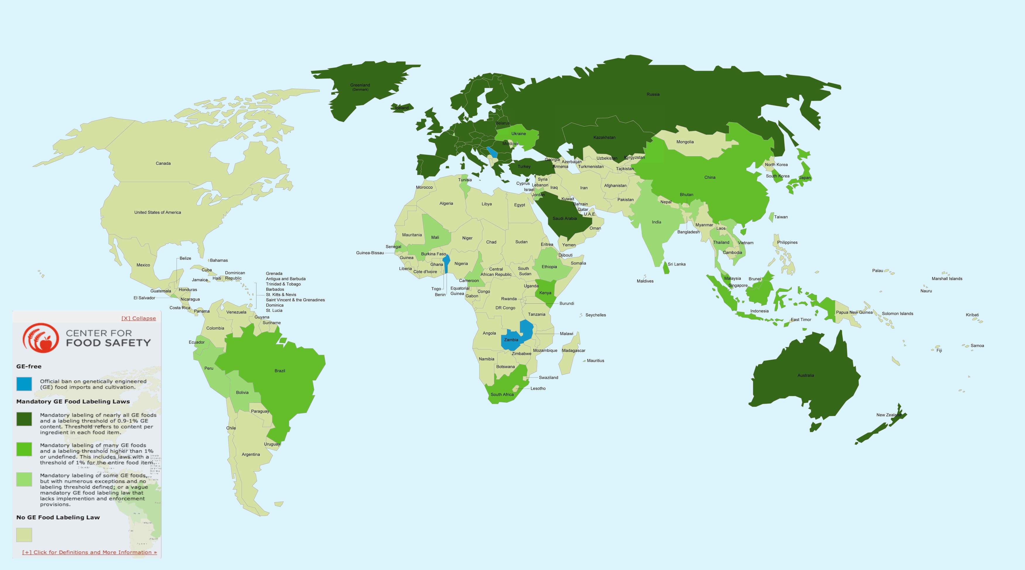 Worried about potential health consequences from the consumption of GMOs, the European Union passed legislation in 1997 requiring the labeling of all GM food products, including animal feed. Currently, United States and many countries in North and South America have no genetically engineered (GE) food labeling laws while a handful of countries across the globe have an outright ban.