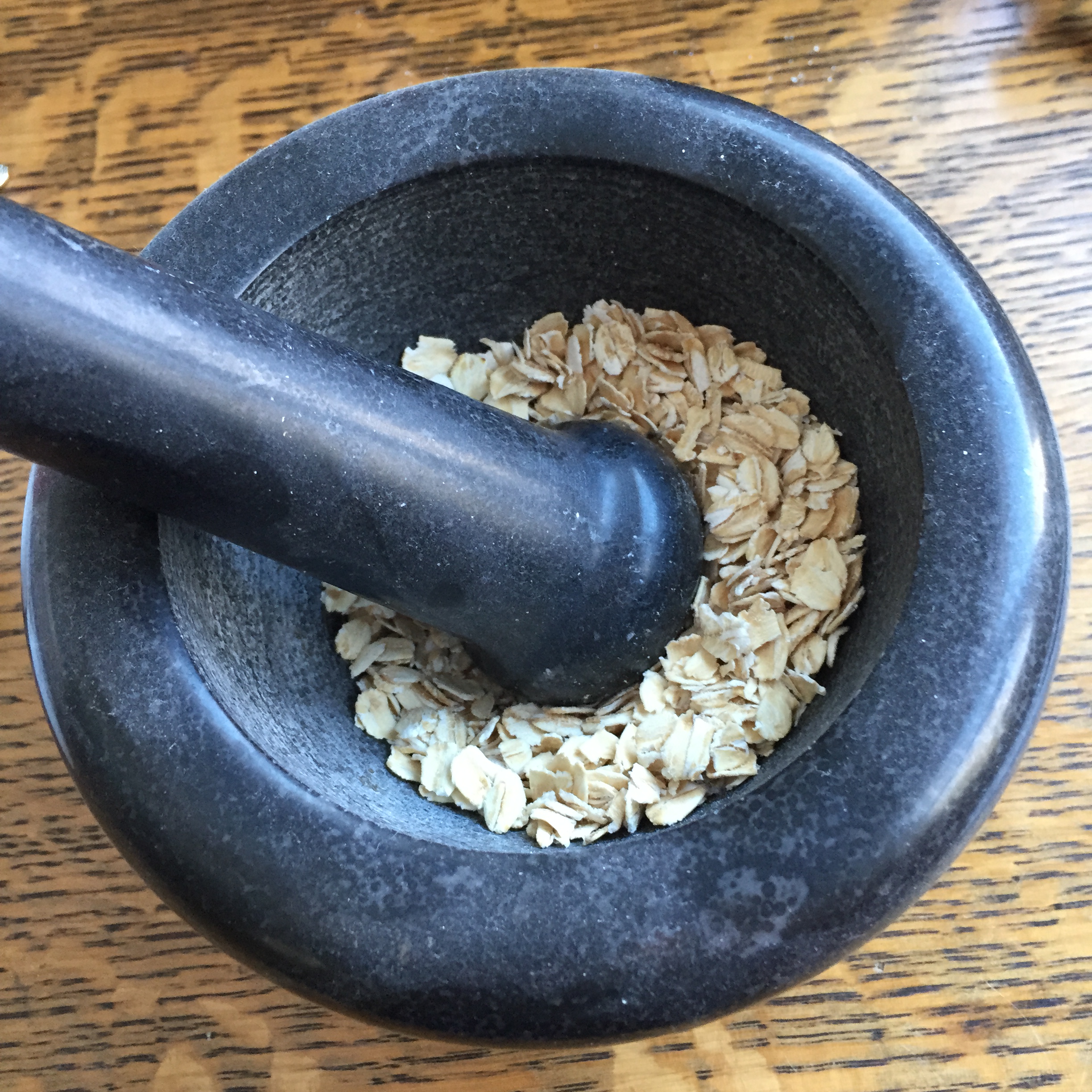 3. In a microwave safe measuring cup, melt coconut oil. Crush rolled oats in a food processor or with a mortar and pestle. Combine coconut oil, coconut flour, oats, water, coconut, chia seeds, sugar and salt in a bowl.