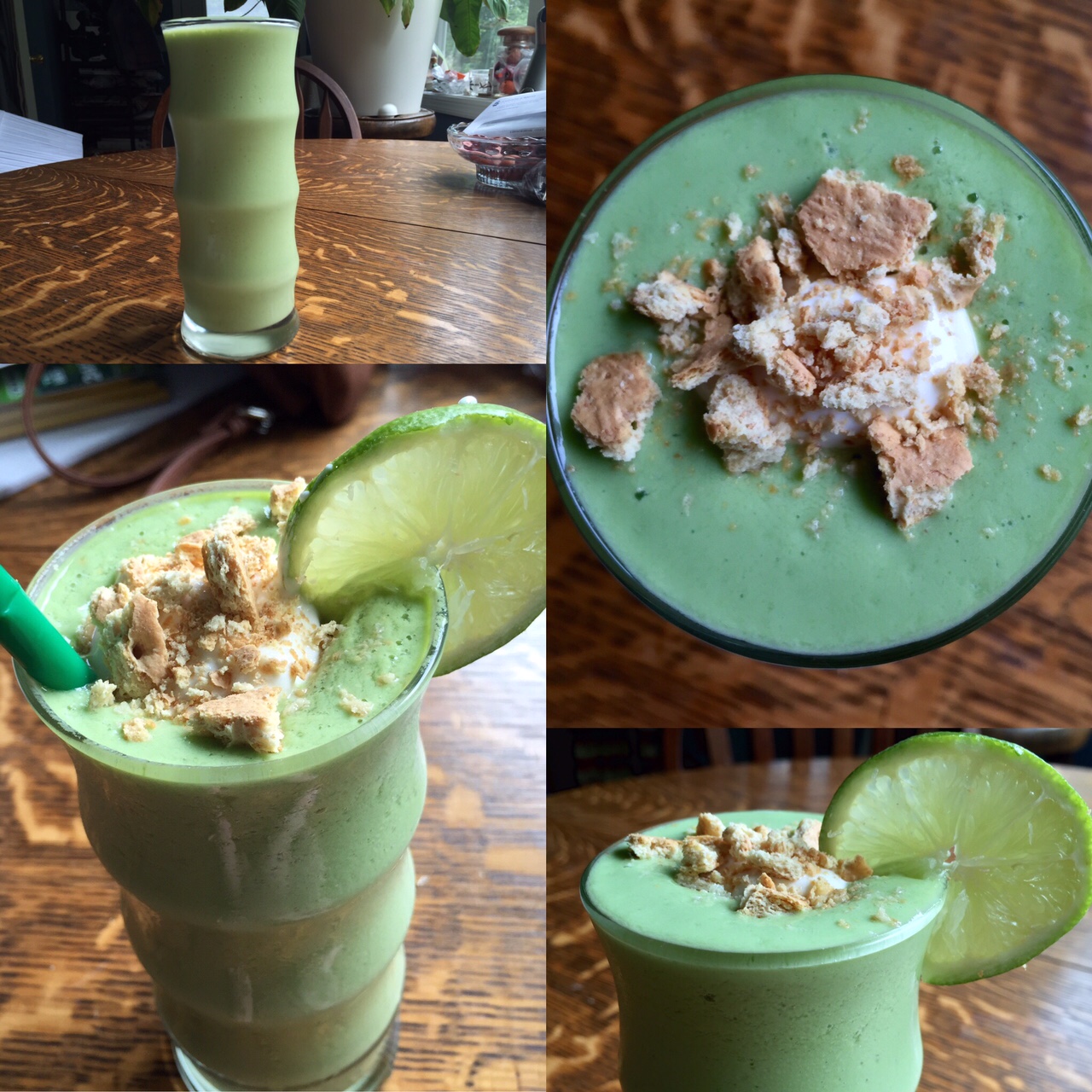 3. Pour the smoothie into a glass (or two), spoon on the topping and garnish with crushed graham cracker and a slice of lime. Drink up!