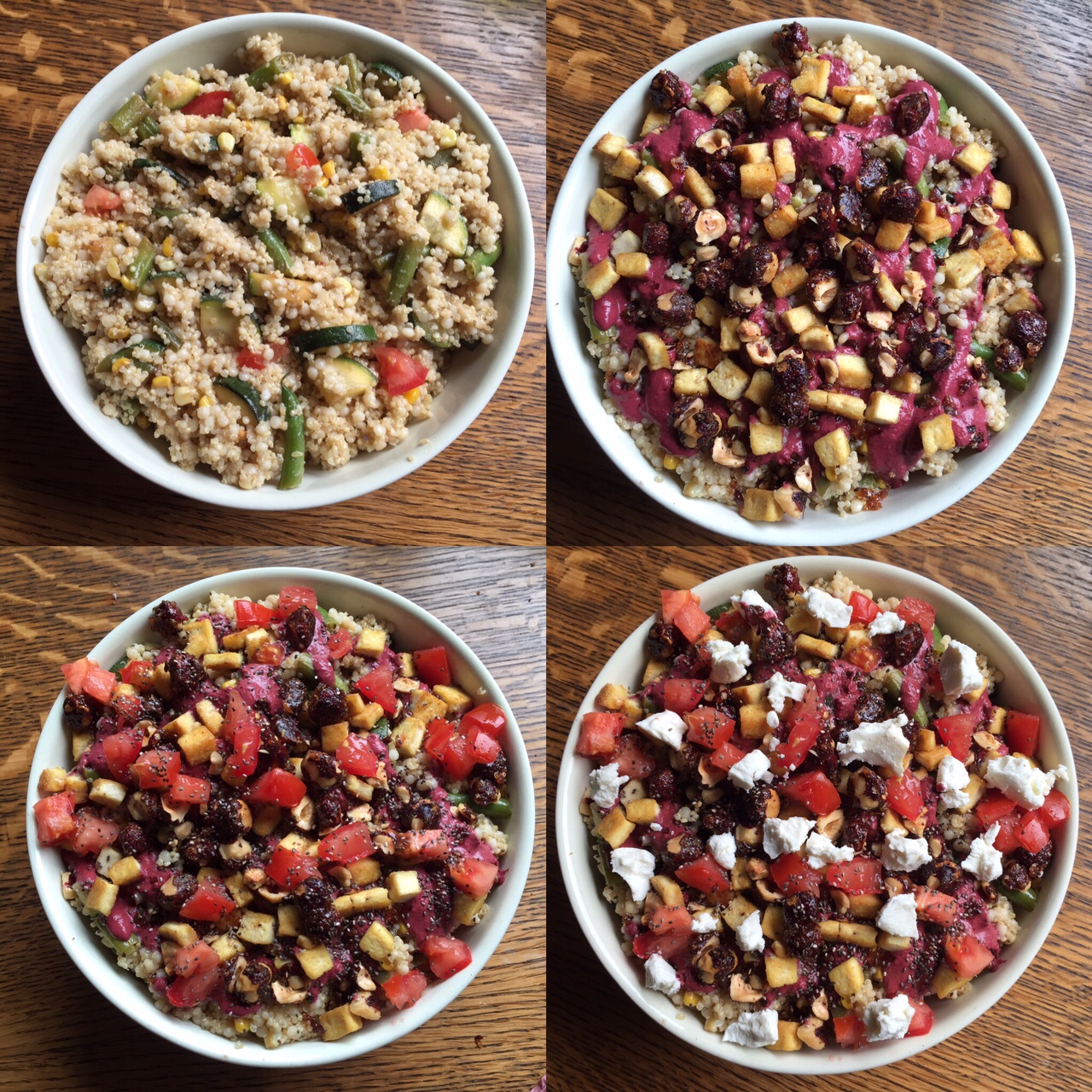 7. Pour the sauteed vegetables into the cooled couscous/quinoa and carefully fold in with a spatula until combined.