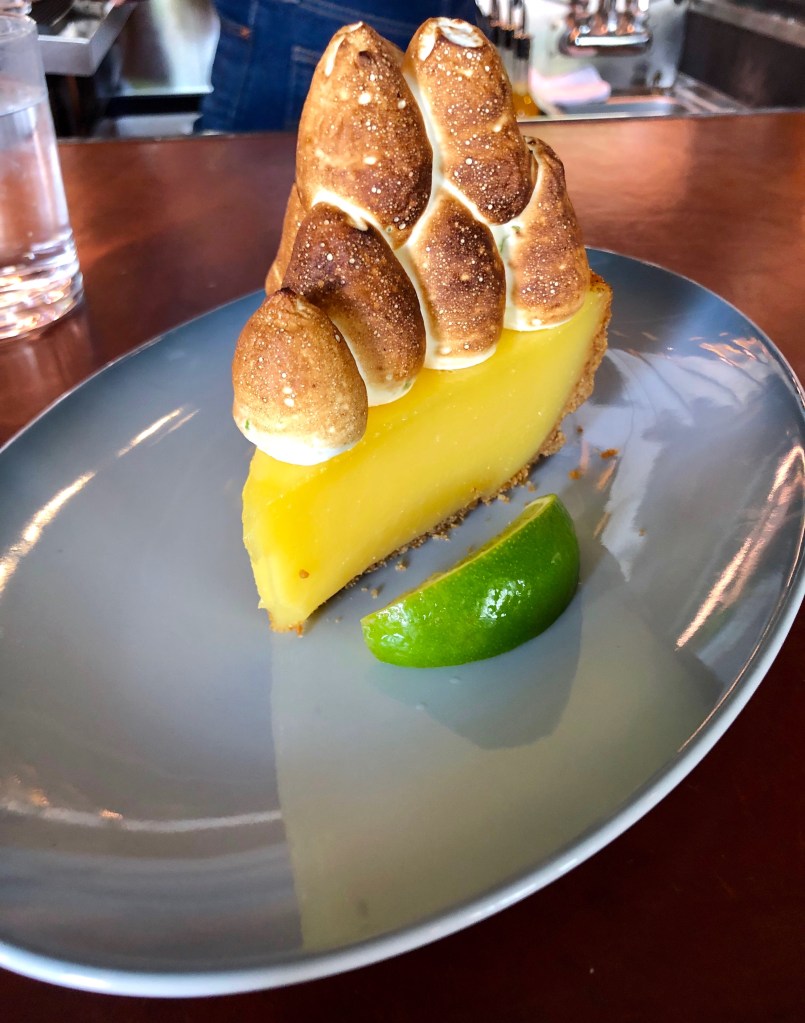 For dessert, I had lemon meringue pie, a buttery graham crust filled with a sweet, mouth-puckeringly tangy lemon curd and topped with a cloud of meringue perfumed with lime zest–a wedge of lime also comes on the side to squeeze over top if you’d like. Delicious and rich, I had trouble finishing my slice.